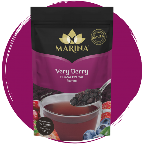 Arándano, uva pasa, mora azul, fresa, flor de hibisco, escaramujo deshidratados y saborizante natural de frutos rojos.